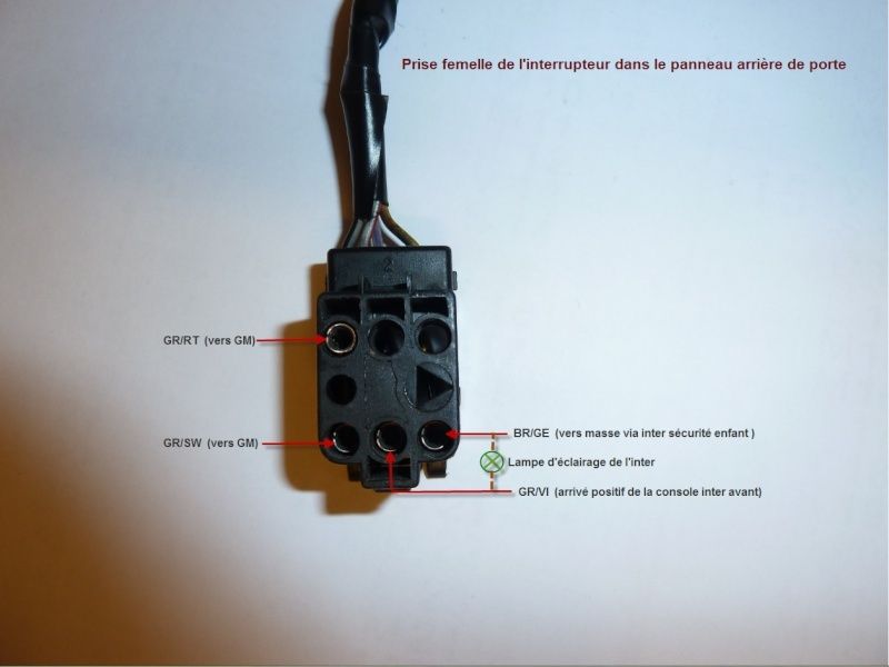 La lampe est câblée entre le fil marron/jaune qui retourne à la masse par l'interrupteur de sécurité enfants et le fil gris/violet qui est une arrivée positive venant des interrupteurs avant.