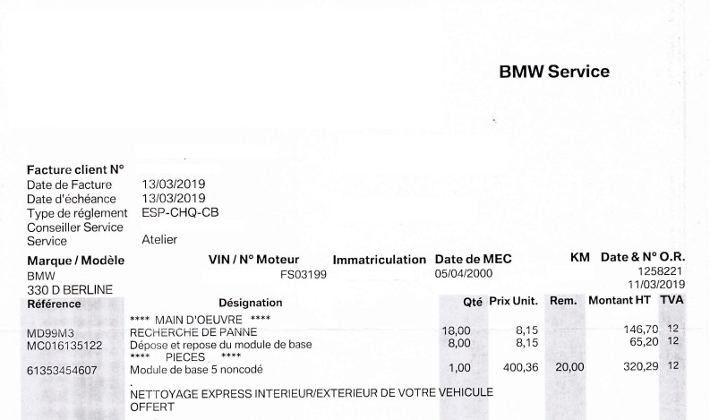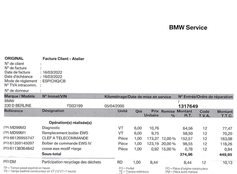 Je tiens également à préciser que le module ZKE a été remplacé par BMW en mars 2019 (impossibilité d’ouvrir les portes) et que le module EWS IV a été aussi remplacé par BMW en mars 2022 (problème de démarrage). Lors du remplacement de ce dernier, j’ai évoqué le problème de centralisation avec la télécommande. Le mécanicien m’a alors indiqué qu’il s’agissait d’un problème lié au module ZKE, auquel j’ai répondu que ce module avait déjà été remplacé trois ans auparavant.