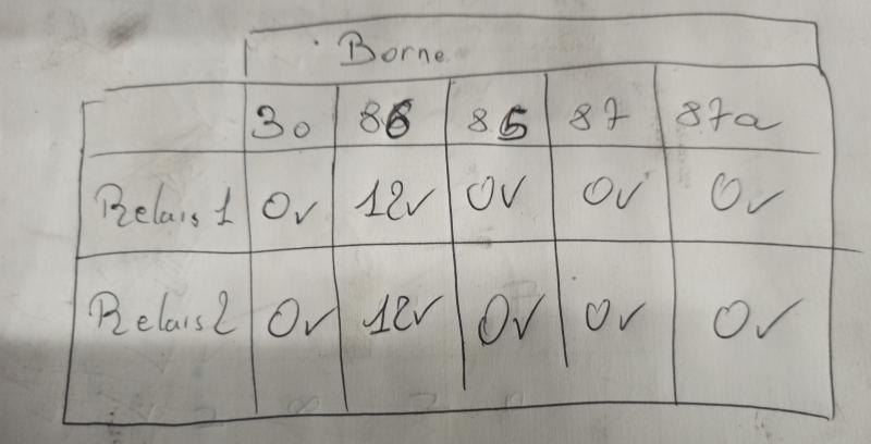 Test réalisé à l'instant, 0v à la borne 30 du relais 2 après pontage du relais 1 Image