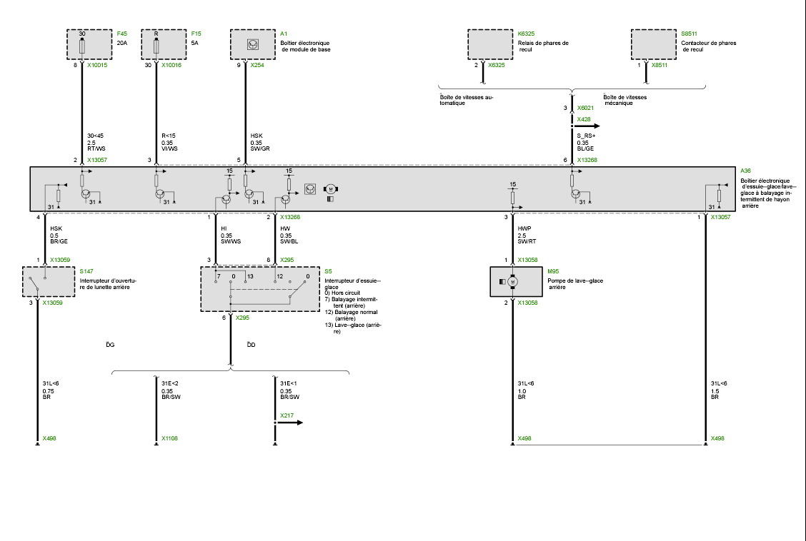 D'après le schéma élec tu as un fil de masse qui va du contacteur MA au boitier électronique d'essuie glace AR.