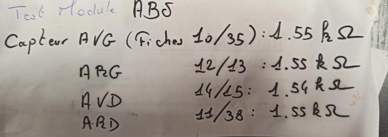 Concernant la vitesse j'ai cru voir que c'était géré via l'ABS ... Les deux capteurs arrière sont neuf et côté boîtier ABS j'ai mesuré les résistances que voici :